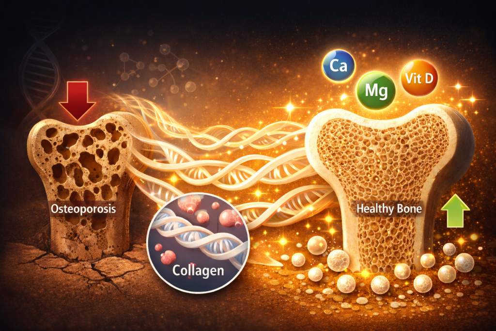 Berbagai penelitian menunjukkan bahwa suplementasi kolagen peptida dapat meningkatkan kepadatan mineral tulang (Bone Mineral Density/BMD), khususnya pada wanita pascamenopause yang memiliki risiko osteoporosis lebih tinggi. Studi terkontrol secara acak melaporkan peningkatan signifikan pada BMD tulang belakang dan leher femur setelah konsumsi kolagen peptida selama 12 bulan. Selain itu, studi observasional jangka panjang hingga 4 tahun menunjukkan bahwa konsumsi kolagen peptida bioaktif tidak hanya mempertahankan, tetapi juga meningkatkan kepadatan tulang pada individu dengan osteopenia. Meta-analisis terbaru juga mengonfirmasi bahwa kolagen peptida memberikan efek positif terhadap marker pembentukan tulang dan menurunkan marker resorpsi tulang, terutama bila dikombinasikan dengan kalsium dan vitamin D (Sun et al. 2025).